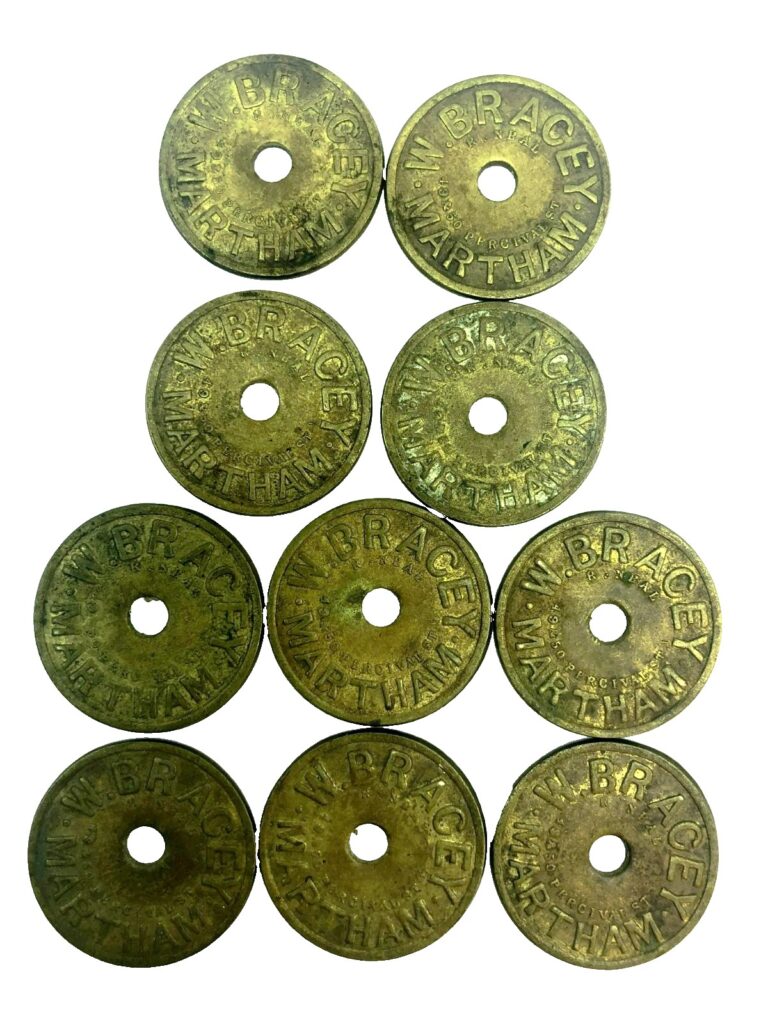Andrew Peachey: It appears that William Bracey senior had gone into business with his son, William junior…a fruit grower and merchant, who among other things appeared to have had a grocers at some point, which may have been where the tokens were originally intended to be spent. The family had bought the Martham Estate including Martham Hall…and many estate workers may also have been wholly or partially paid in tokens, especially if low currency was scarce. I suspect they may have been retained and recirculated over the years to help with accounting in fruit picking…very impressive and practical. The tokens were originally made in London and would have to be ordered in bulk but would have been seen as a practical investment for an estate.