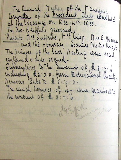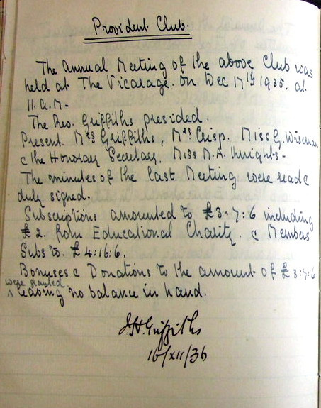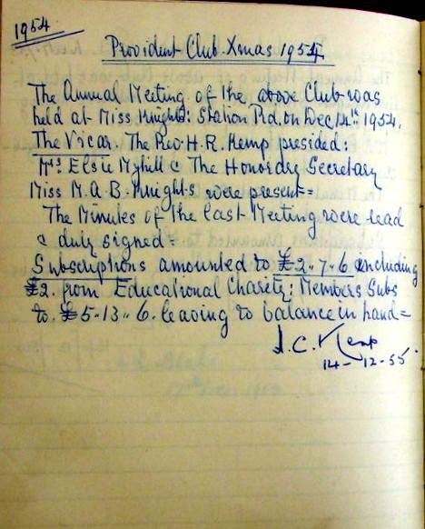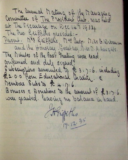 Over the 76 year history of the club the Committee members evolved and, perhaps more fittingly, ladies fulfilled the roles. Most of these were daughters of local men who were landowners, farmers or successful businessmen. In those days most single young ladies from this class of society did not work and had little to occupy their time other than helping out with ‘good works’. During its last 50 years or so the Committee appears to have been automatically chaired by the Vicar of the day and at various times included Rev. Webster, Bishop Hamlyn, Rev. Griffiths, Rev. Stenhouse and Rev Kemp.