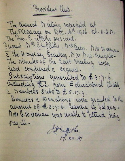 The Committee members decided how much should be paid to each member of the club. Sometimes there were very small expenses and in the early years a small balance was usually retained and carried forward to the next year. The accounts also show that in some years ‘special cases’ were given one-off grants and these occasionally included widowers as well as widows.
