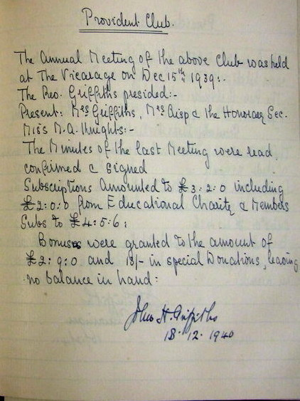 1940 | £2 | £1 6s 0d | £4 4s 6d | ? | Rev. John H Griffiths | |||||||||||||||||