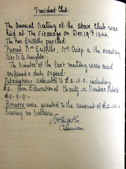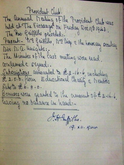 1944 | £2 | £0 15s 0d | £3 9s 9d | ? | Rev. John H Griffiths | |||||||||||||||||