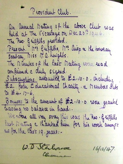 1946 | £2 | £0 10s 0d | £4 17s 6d | ? | Rev. John H Griffiths | |||||||||||||||||