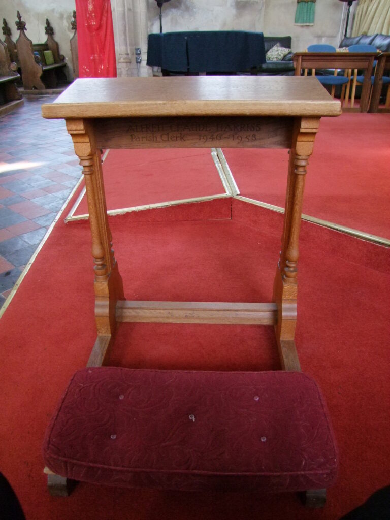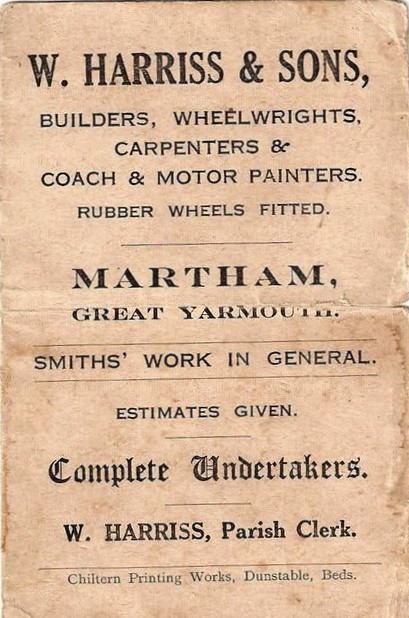 3. Alfred Claude HARRISS who was born on 14th September 1901 and baptised a month later on 13th October at St Mary’s. He became a wheelwright, working at first with his father but later in his own right as a carpenter and builder after his father died. He married Helen May TOOKE on 27th August 1924 at St Mary the Virgin. During 1946-1958 Alfred followed in the footsteps of his father by becoming the Parish Clerk at St Mary’s and there is a small lectern in the church that commemorates his service. He died on 9th January 1958 at Gorleston Hospital, Great Yarmouth, aged 56. After his death the Harris firm continued under the name H.M. Harris & Son based on the forenames of his wife Helen May.