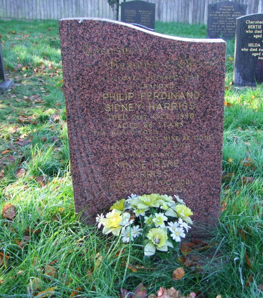 8. Ferdinand Philip Sidney HARRISS, known as Philip, was born on 28th October 1913 at Caister-on-Sea and was baptised at Holy Trinity Church, Caister on 7th December 1913. He married Minnie Irene KING in 1940 at Winterton-on-Sea at which time he was a bricklayer working with family members on their building projects that included 114 Repps Road where they lived later in life. Philip died on 21st October 1980 and Minnie on 20th August 2001 and they were both buried at section I, plot J9 at St Mary‘s graveyard.