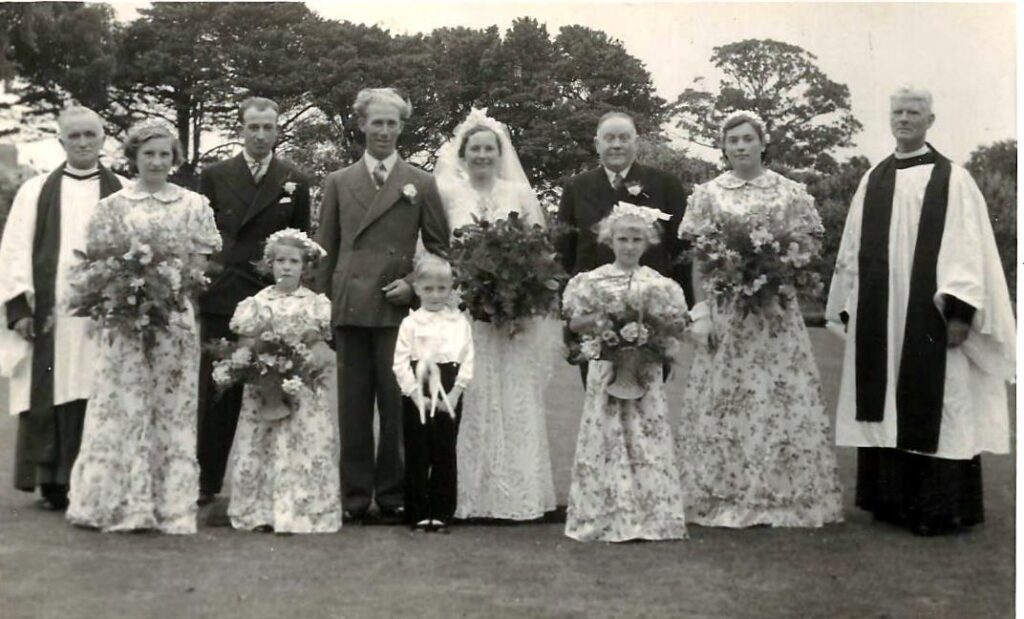 Miriam Harriss & Roy Randell with their bridesmaids at their wedding on 15th June 1940 in the Vicarage Garden at St Mary the Virgin, Martham. The Vicar on the left was Rev. John Herbert Griffiths.