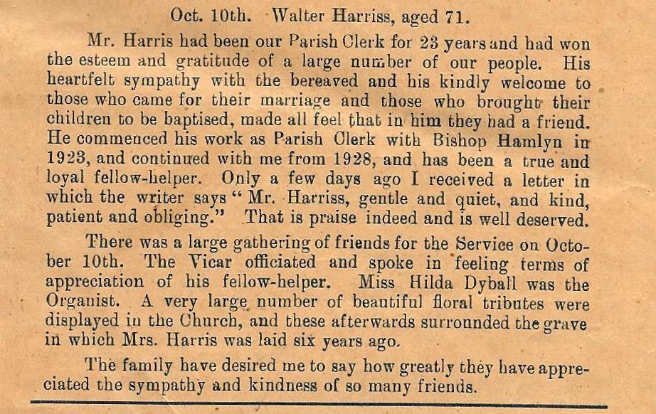 The Rev. John Herbert Griffiths, Vicar of St Mary’s, penned a tribute to Walter, that shows what the community felt about him and is shown below. It was published in the Parish Magazine.