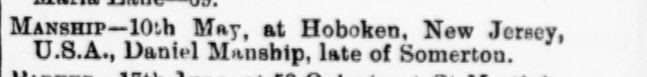 Sadly, Daniel also died about 21 months later on 10th May 1893 at Hoboken. New Jersey. He was 71.