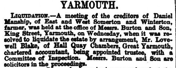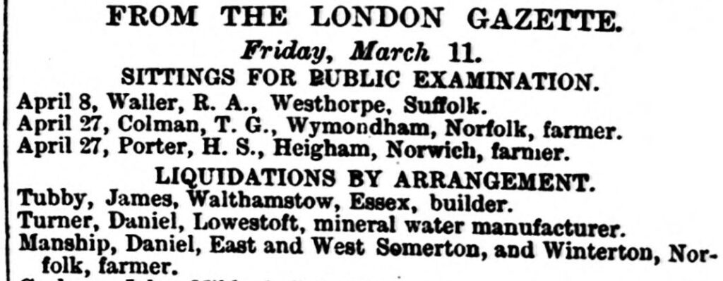 At the time of the census in 1861 Daniel & Selina were living at The Green in Martham where he farmed 27 acres and employed five labourers and five boys. Over the course of the next 10 years, Daniel expanded his farming interests massively and by 1871 lived at Bloodhills Farm House, West Somerton where he farmed 270 acres and employed 10 labourers, three boys and two servants. We will probably never know if he over-stretched himself; if there were several bad harvests or if there was a down-turn in farming at the time but in March 1881 things had caught up with Daniel and he was declared bankrupt. The two entries below announced his downfall in the press.