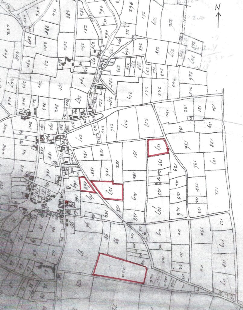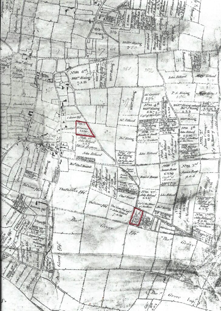 The two plots are shown on the map below. These two plots amounted to 6 acres, 2 roods and 16 perches so between 1807 and 1812 it seems John must have either sold some of the copyhold land he had claimed in 1807 or was able to buy it so that it became freehold. The freehold land he owned was not included in the 1812 Award.”